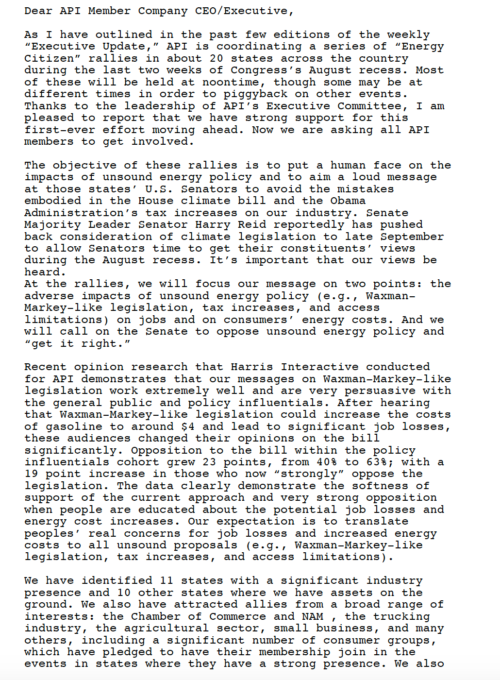 Their best-known example is the Energy Citizens group, which claims to be a bunch of citizens who are just worried about reliable, affordable energy, but in fact were created by Edelman and its client the American Petroleum Institute, the fossil fuel industry's trade group. In January, 2012, Energy Citizens launched a new national ad campaign in advance of the 2012 elections to try and make it sound like public support exists for increased drilling. The print and TV ads, coordinated by the Edelman PR firm, were titled "I'm an Energy Voter." They feature supposedly average people looking into the camera and saying "I vote ...for American domestic energy " and promoting the industry's goals of opening up more land to oil and gas drilling. The ads linked increasing drilling to job creation, economic prosperity and national energy security, and drive people to the website Vote4Energy.org. The homepage of the website gave no indication that Energy Citizens is a creation of the oil industry.