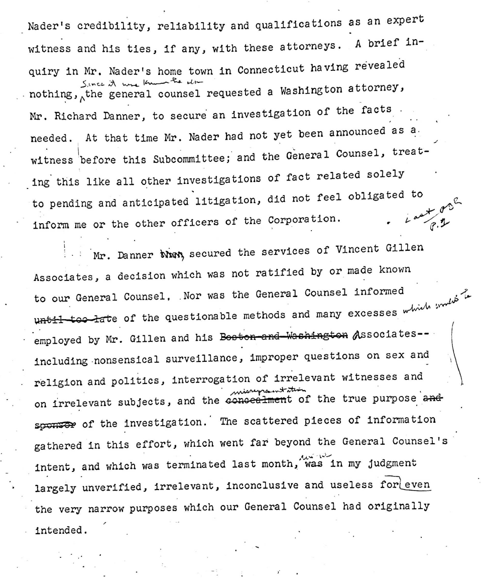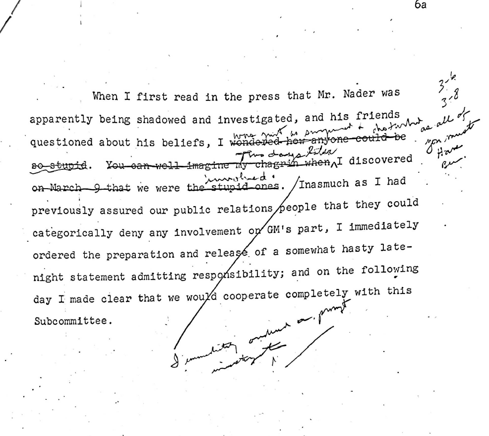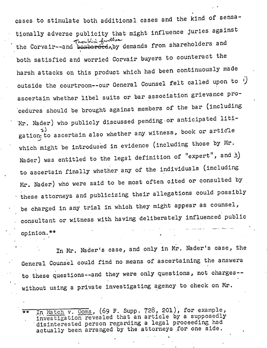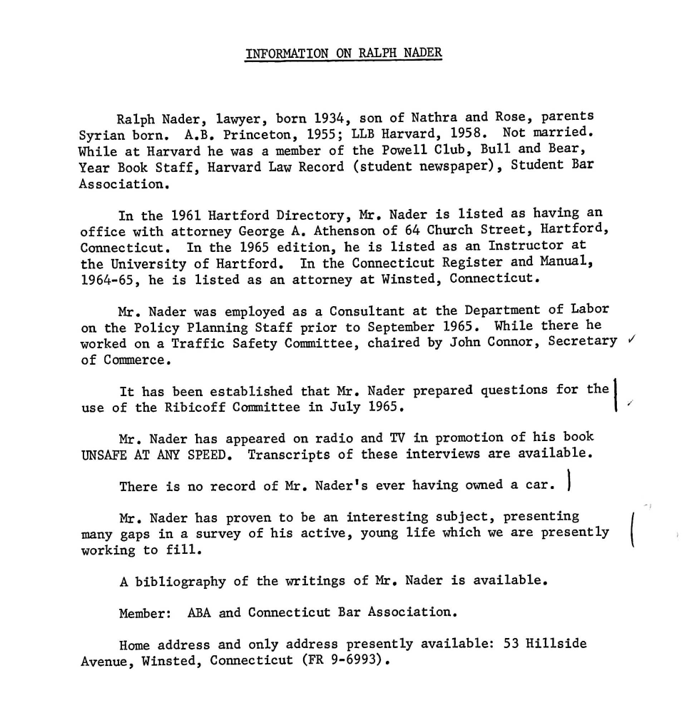 Most people under the age of 40, if they know Ralph Nader at all, know him as a Green Party presidential candidate back in 2000. But long before he got into politics, Nader was a lawyer and a consumer protection advocate, and he first burst onto the national scene around one issue that seems downright innocuous today: seatbelts. Nader lived on a road where car crashes were pretty common, and people often died in them. He started looking into it, realized that seatbelts were highly effective and that automotive manufacturers were cutting corners on safety, and decided to do something about it. The book Unsafe at Any Speed was published in 1965 and freaked not only the automotive industry, but all industry, out in a big way. Because the Chevrolet Corvair was a particular focus of Nader's, General Motors was particularly irked. They hired a private investigator to follow Nader around and try to dig up dirt, they even set up an attempted honeypot, sending young women to try to entrap him. None of it worked--instead Nader busted them and called them out publicly. Eventually GM execs were hauled in front of a Congressional investigation committee, publicly embarrassed and forced to apologize to Nader. So... the plan failed, but industry would continue to see Nader as a threat and target him, and over time their efforts to discredit him largely worked, painting him as a radical who was dangerous for the country.
