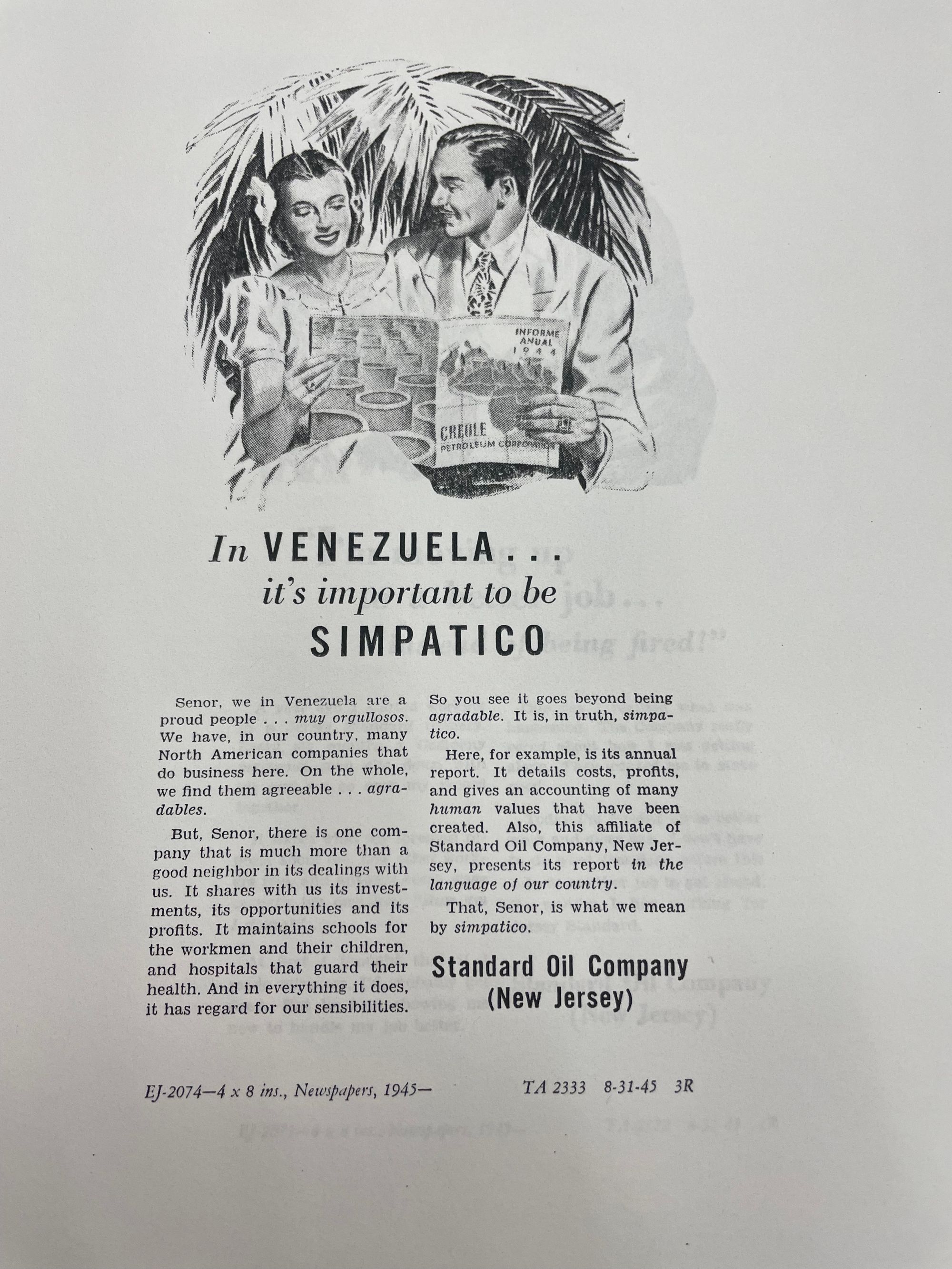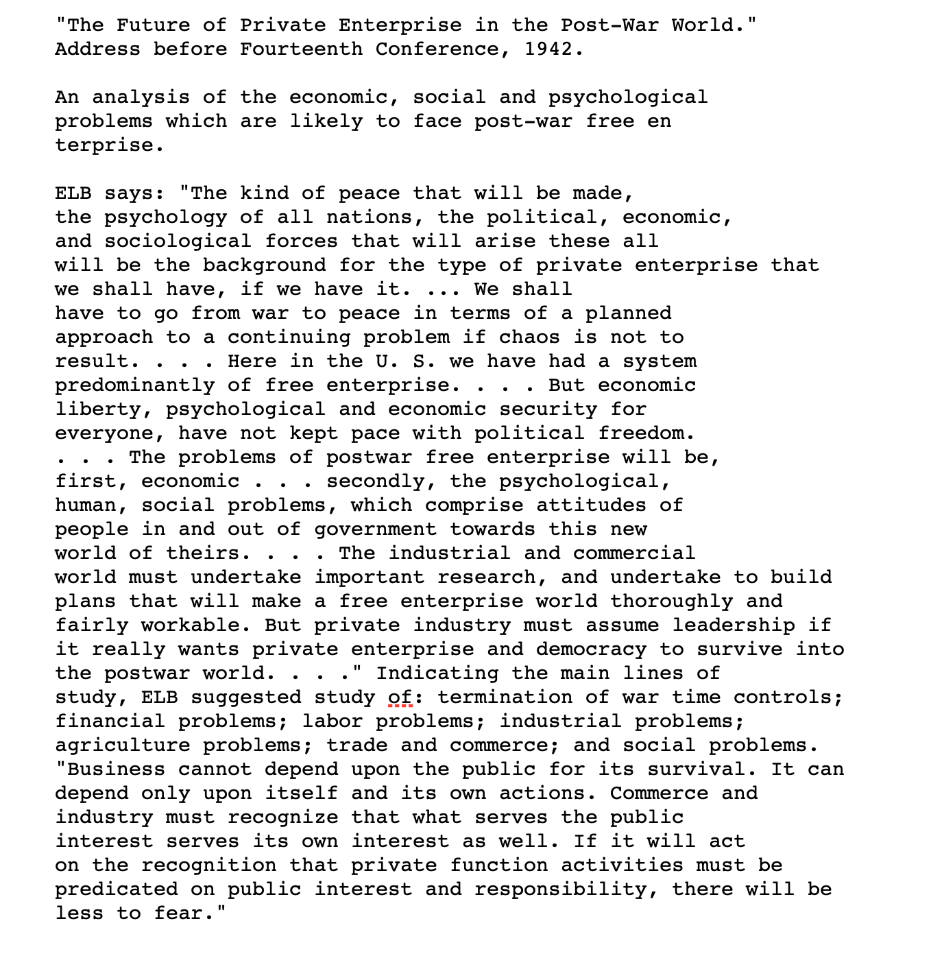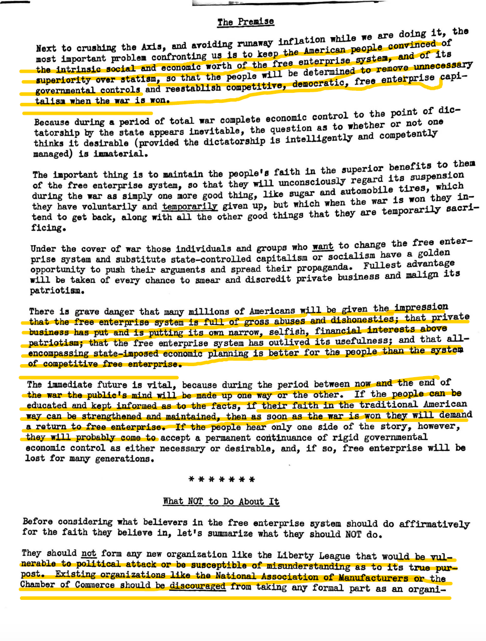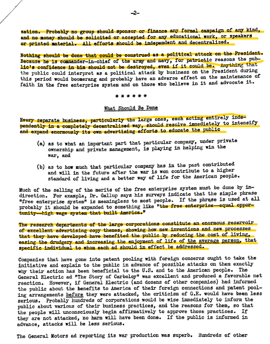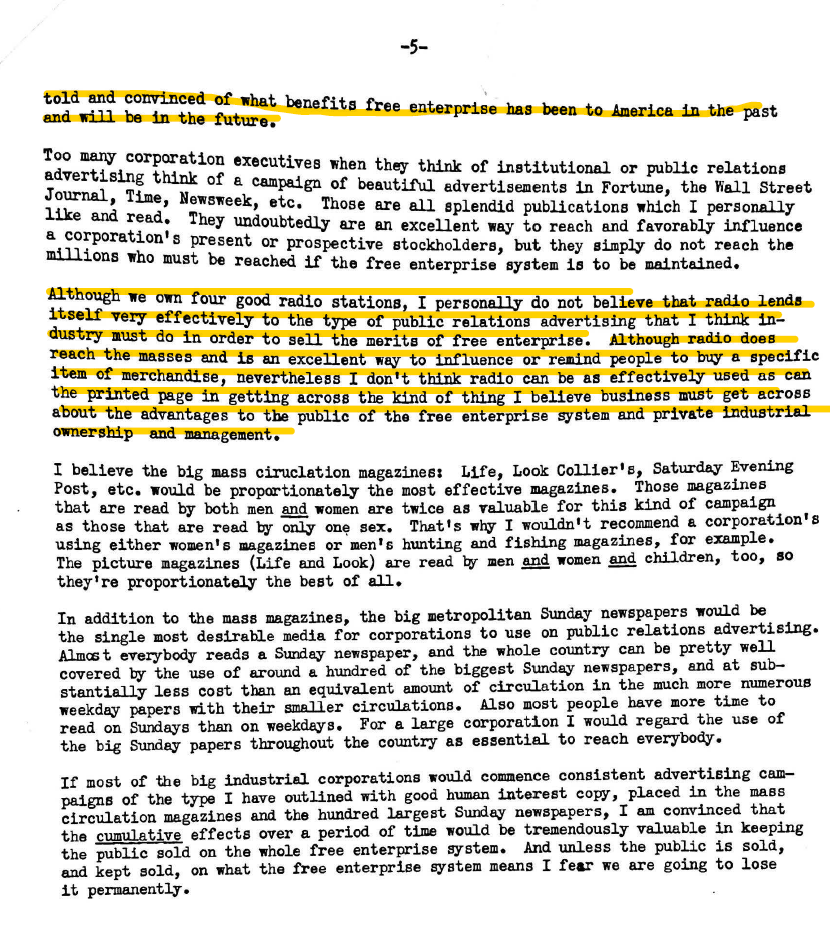 The first document shown here is an excerpt of Edward Bernays' famous 1942 speech, "The Future of Private Enterprise in the Post-War World". To give you an idea of how much impact that speech had, Bernays turned it into a booklet and created a giant scrapbook of the thousands of people and institutions that asked for a copy. The remaining five pages are a strategy Earl Newsom crafted for his clients (Standard Oil of New Jersey, Ford, and more) to ensure that Americans would continue to embrace "free enterprise" after the war. Between the two of them, Bernays and Newsom had the ear of every powerful executive in America at the time, and they were both concerned that Americans, having experienced the sort of security a highly competent government could provide, might turn against the idea of private enterprise. Newsom described it as a threat equal to that the Axis of Evil posed. Both men counseled their clients on campaigns that would combat such a turn, with an emphasis on investments in research and development, futuristic new products, good wages and benefits for employees, and ads that highlighted all the benefits competition and free enterprise bring to the public but that never, under any circumstances, used the words "free enterprise" or "private enterprise."