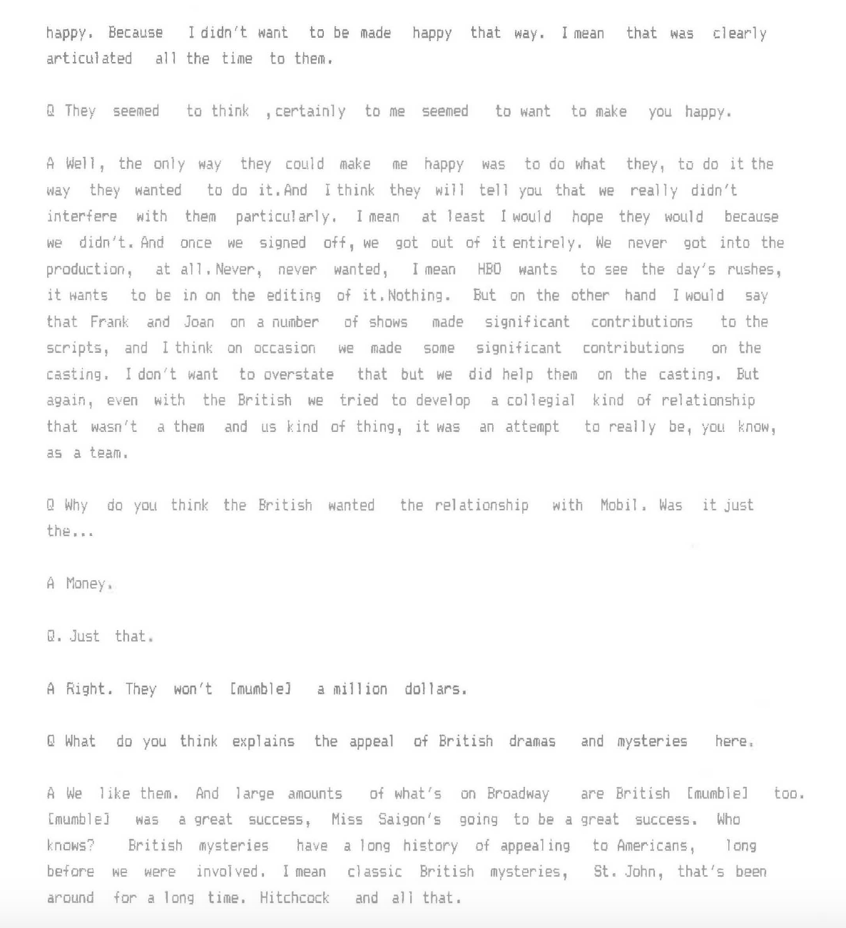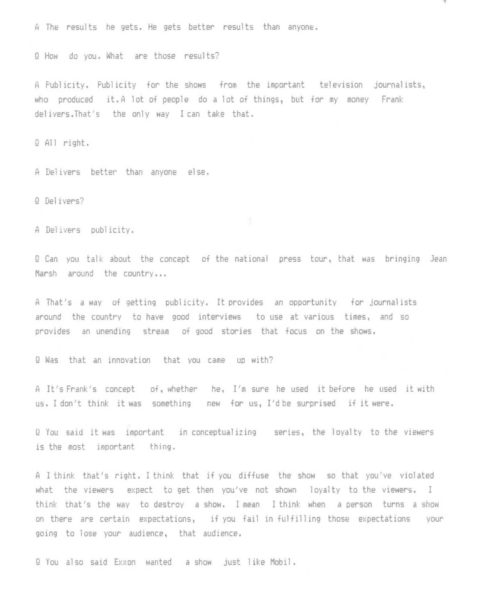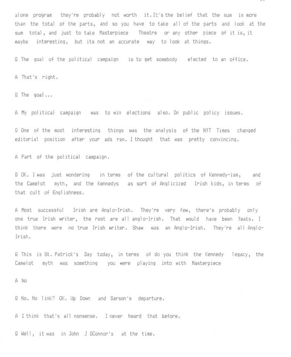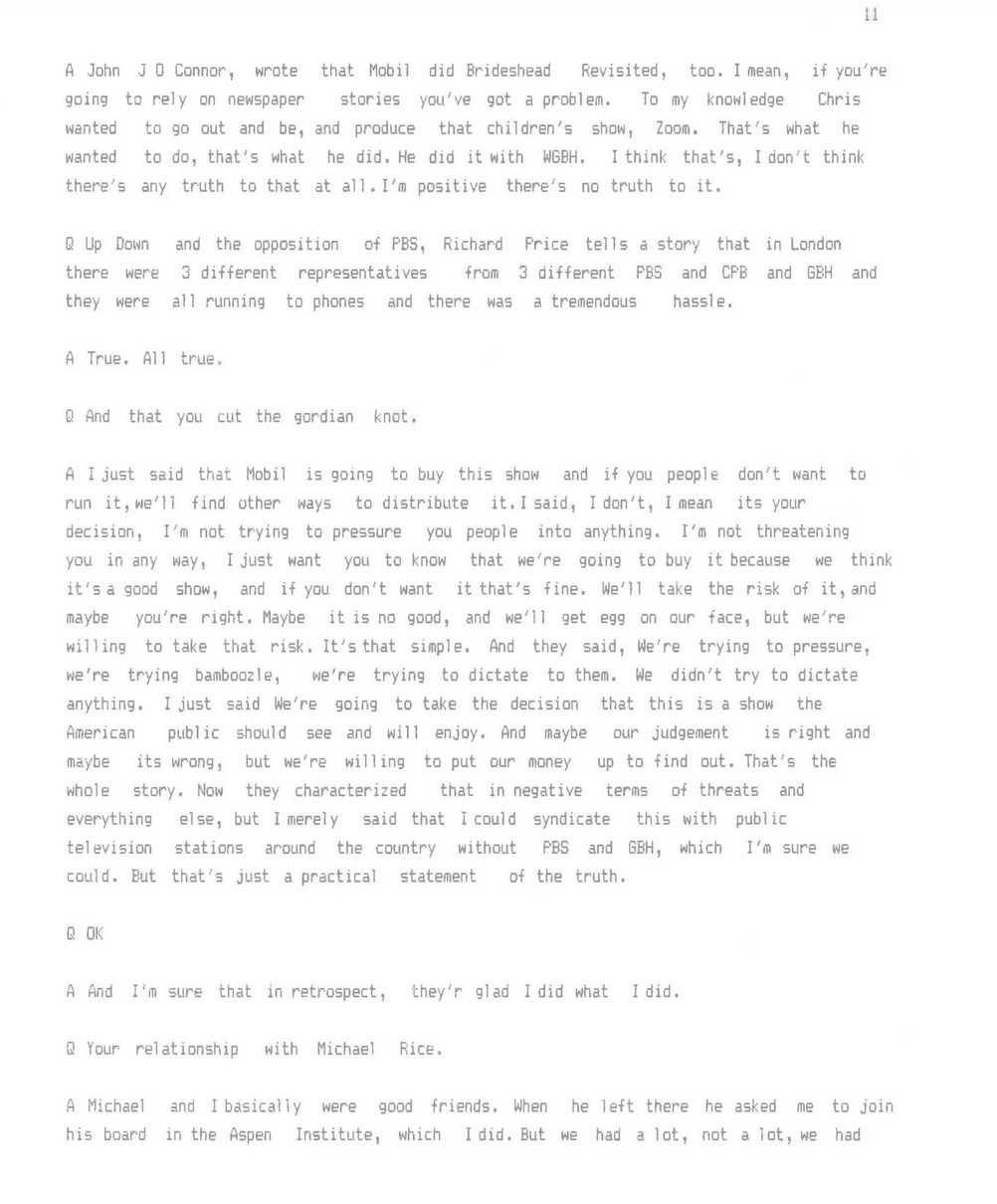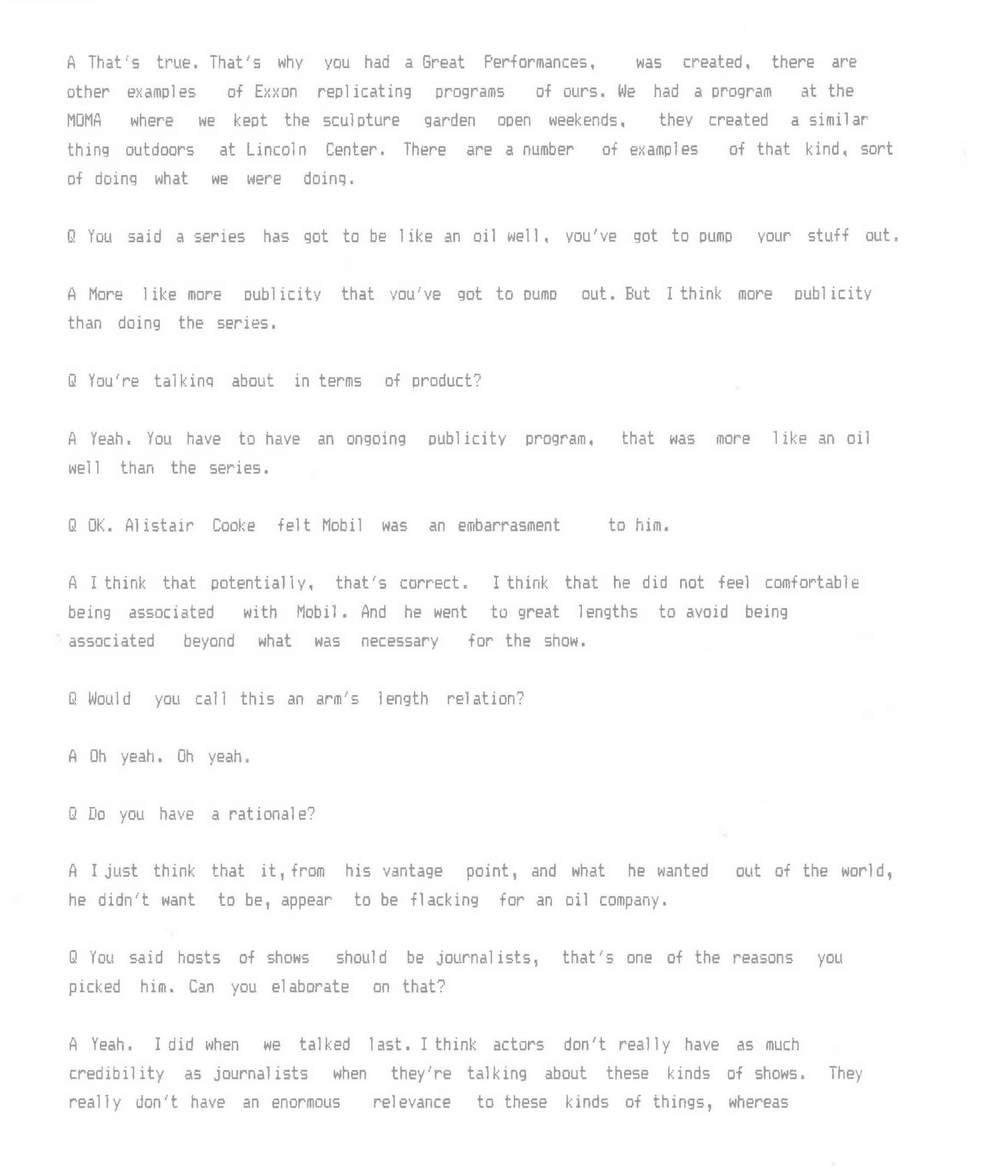 For decades, PBS maintained that Mobil Oil simply underwrote the costs of Masterpiece Theatre and their involvement ended there. But the long-buried transcript of an interview with Schmertz that we found at the University of Maryland, he tells a very different story. Schmertz also delves into his relationship with The New York Times in this interview, and why he approached marketing Mobil "like a political campaign."