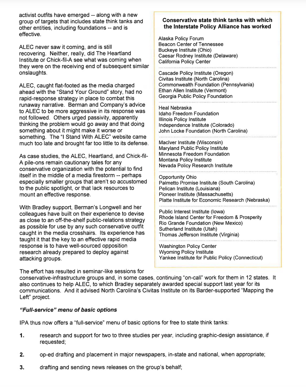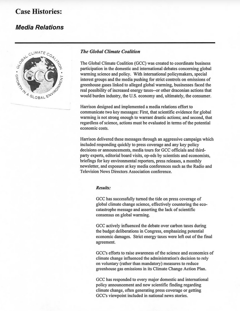 E. Bruce Harrison was particularly adept at creating cross-industry groups that could accomplish more lobbying together against certain types of environmental regulation than they could ever accomplish on their own. The first client of the firm he started with wife Patricia de Stacy Harrison was a coalition the two had pulled together of industries that had a bone to pick with the Clean Air Act and Clean Water Act, it was called the National Environmental Development Association, described as "a partnership of labor, agriculture and industry working for better environmental solutions together." As concern about global warming began to increase in the 1980s, Harrison pulled another group together, this time of fossil fuel, automotive, rail, manufacturing companies—anyone whose bottom line might suffer if emissions were regulated—into a group he called the Global Climate Coalition. Harrison also started an international group called EnviroCom, which pulled together international PR firms interested in licensing his particular approach to environmental communications. Using these two groups, he was able to ensure business a seat at the table during the crafting of the UN Framework on Climate Change (UNFCC), the framework every report from the Intergovernmental Panel on Climate Change has been based on since the very first one in 1992. The first document shown here is Harrison's own case study for the Global Climate Coalition, given to researcher Melissa Aronczyk as she was working on her book, A Strategic Nature. In it, he writes that the two-pronged focus of the group was to communicate: