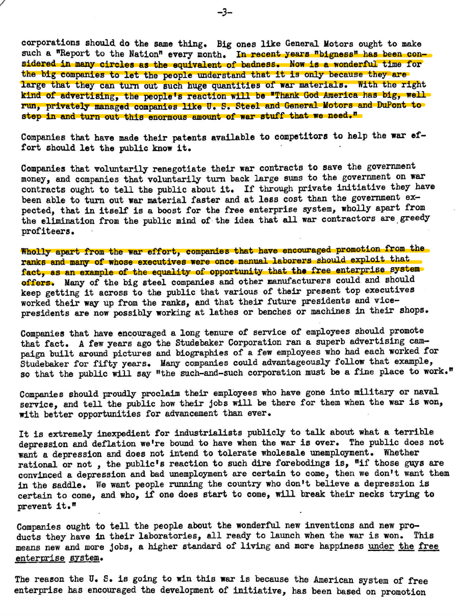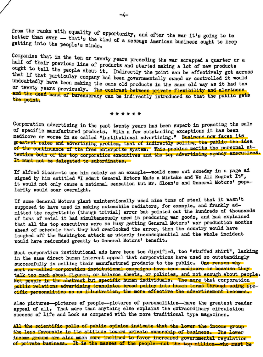 Earl Newsom worked for Standard Oil of New Jersey, which eventually became Exxon, from the early 1940s til he retired in the mid-1960s. He managed every aspect of the company's public persona, from seemingly inconsequential decisions like whether or not a VP should accept an award from a PR college for his work on education (Newsom said no, lest people think Standard's investments in universities were just a PR stunt) to the company's approach to developing oil fields in South America and the Middle East to cross-industry strategies for shaping how Americans think about the economy. One of the most fascinating documents Newsom left behind was a strategy document from early in the year in 1945. WWII was coming to a close, and Newsom was concerned—not that the Allies would lose, or that the companies he worked for would have to find new revenue streams once wartime purchasing ended, but that Americans had grown so used to the government taking care of them that they might turn away from the benefits of free enterprise. At the time, Newsom was working for Standard Oil of New Jersey, Ford, and GM, but the plan included non-clients too, it was an all-hands-on-deck moment for industry.