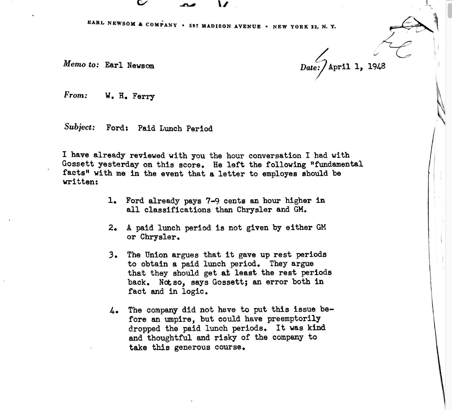 Newsom's longtime friend and collaborator the pollster Elmo Roper started pushing Ford to hire Newsom in the 40s and initially Newsom actually said he was too busy. He thought Henry Ford and his son Edsel would be too tough to manage. This is where you really see how different Newsom was from most of his compatriots in the field. He really saw himself as a close advisor to CEOs, managing every aspect of their relationship with the public. And he couldn't do that—wouldn't do it—with a difficult CEO. But in 1945, Newsom had a meeting with Henry Ford that convinced him; he set about turning the elder Ford into what he called "an industrial statesman," giving speeches, meeting with politicians, acting as a sort of ambassador for American industry to both the U.S. public and the world. Newsom counseled Ford through the highly controversial move of pulling the paid lunch period post-war, crafting and executing an internal communications strategy that painted the company as benevolent and fair, the idea of paid lunch as Communist, and the striking employees as criminals.