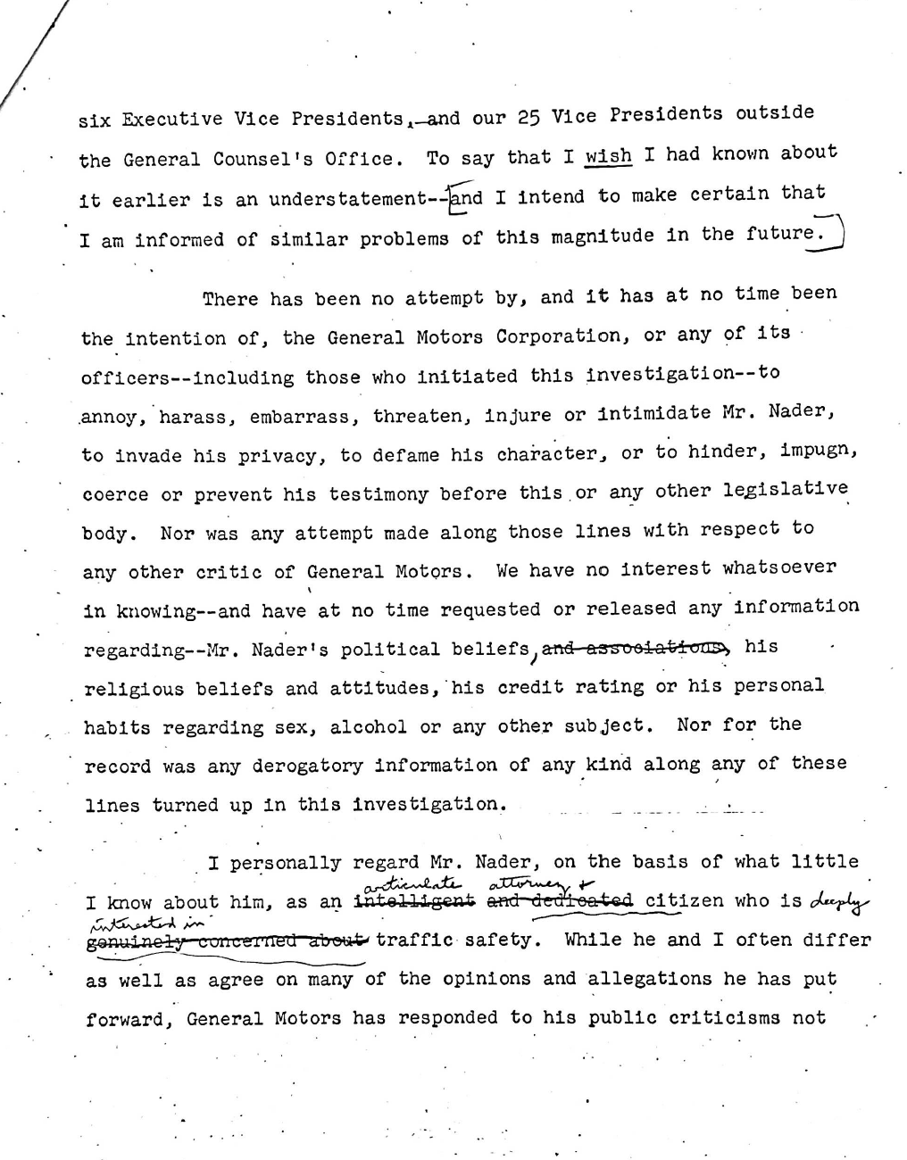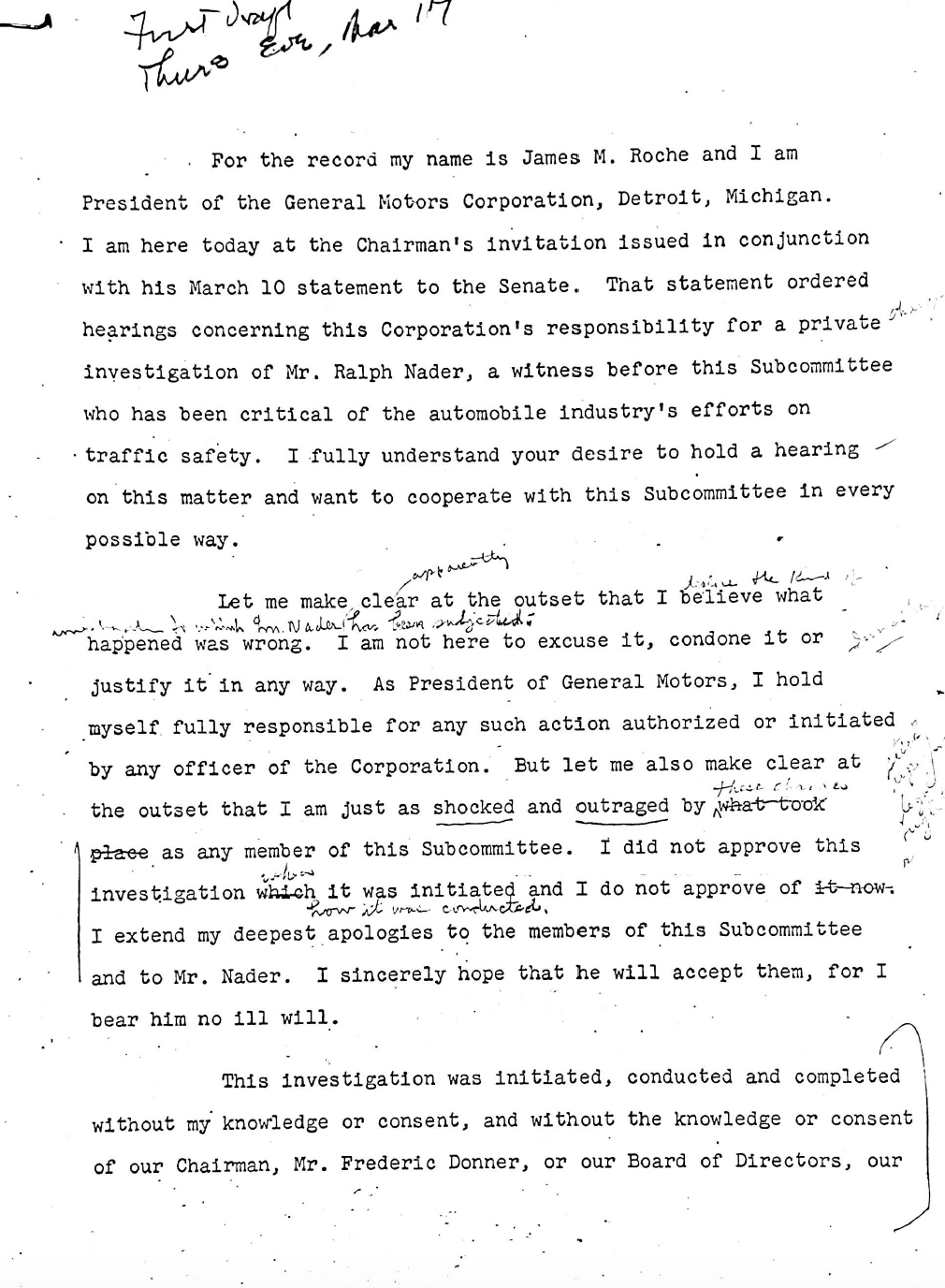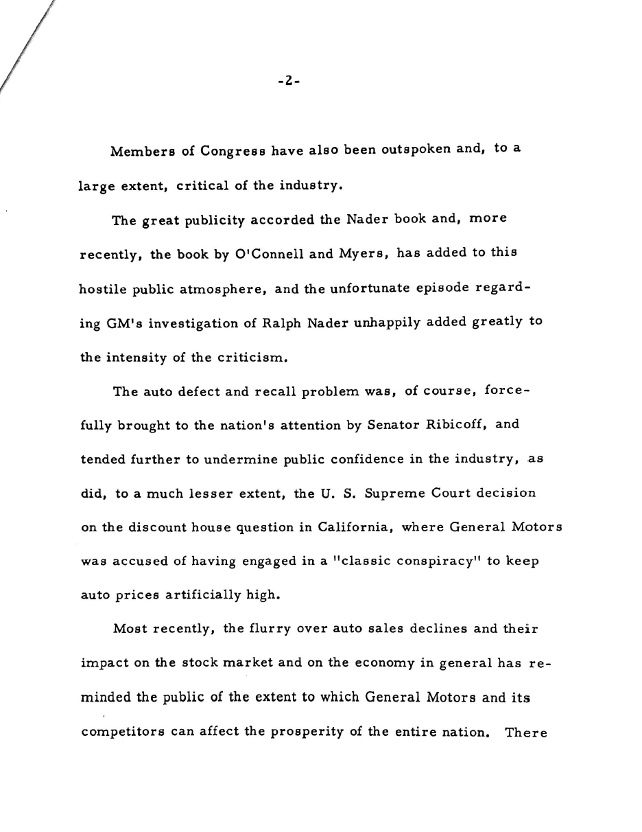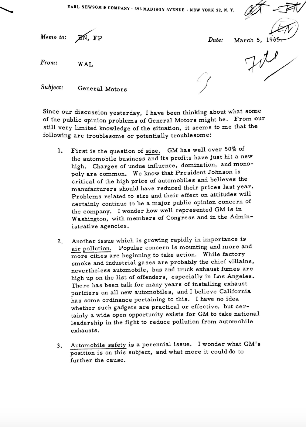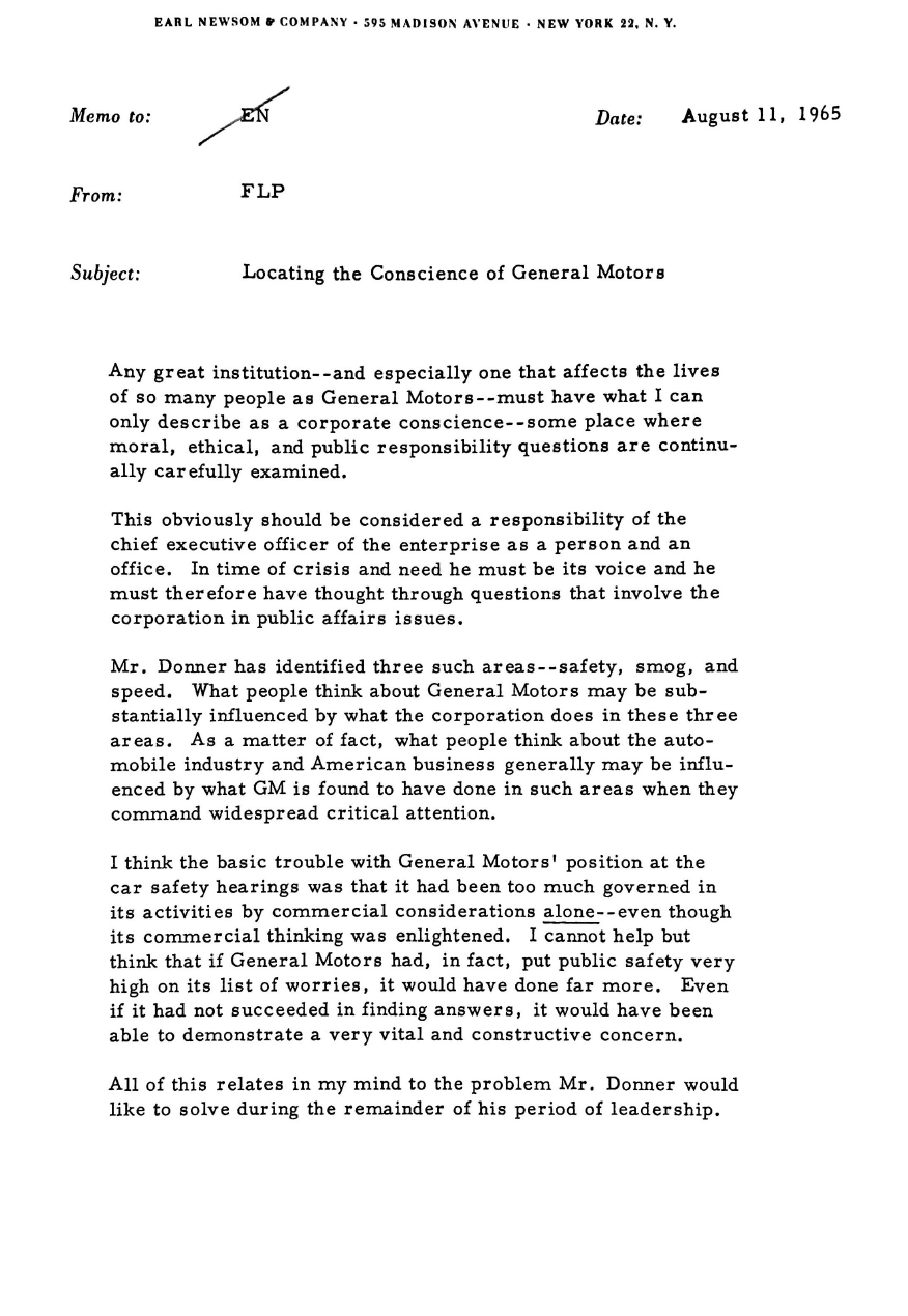 Newsom also worked for General Motors in the 1960s during a particularly tough time for the company, when it was dealing with the fallout of Ralph Nader's seminal 1965 book, Unsafe At Any Speed. More so than the book itself, GM faced public backlash and a Senate investigation over its handling of the book, which included gathering opposition research on Nader and even trying to entrap him with young women. Newsom counseled GM's executives through the Senate hearing and apology for the Nader debacle, and through various skirmishes with labor unions over the years.