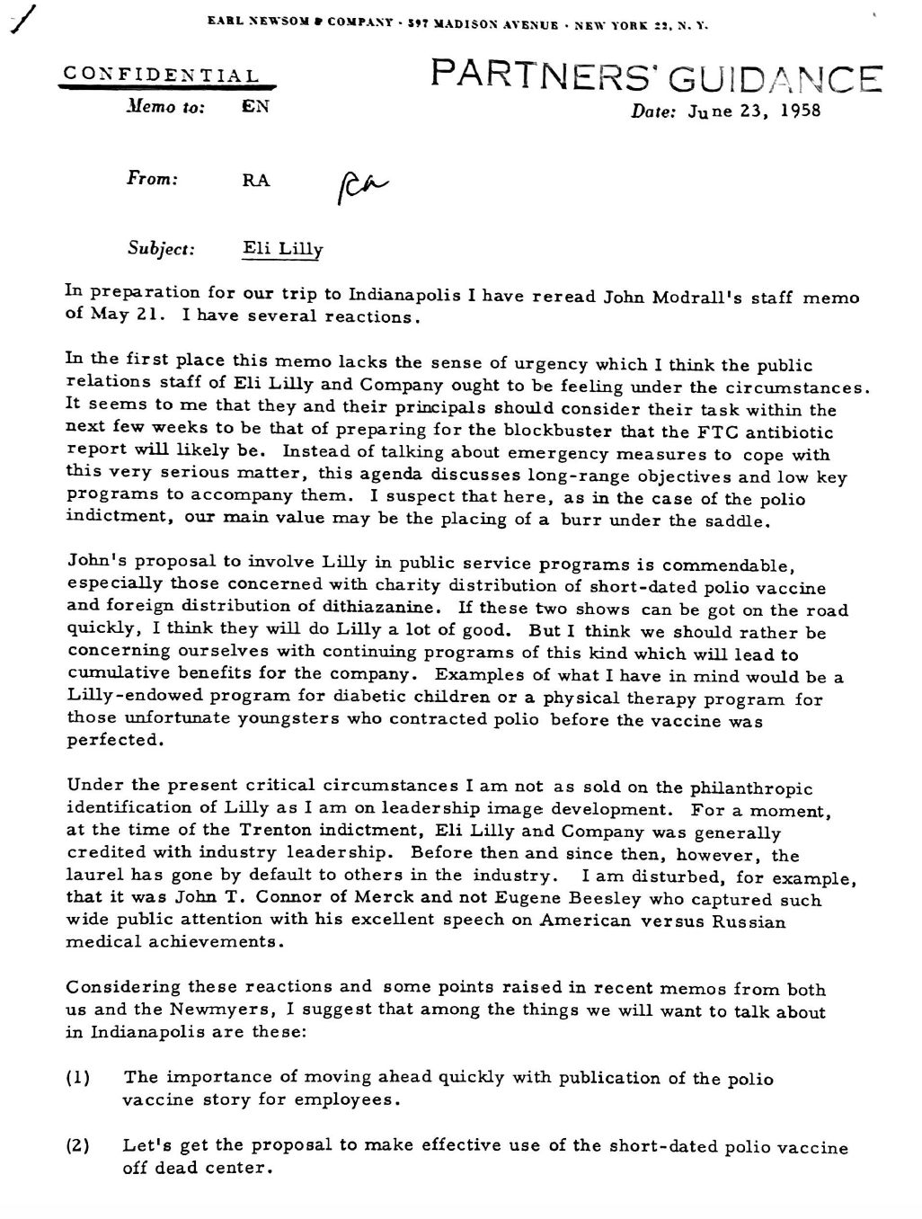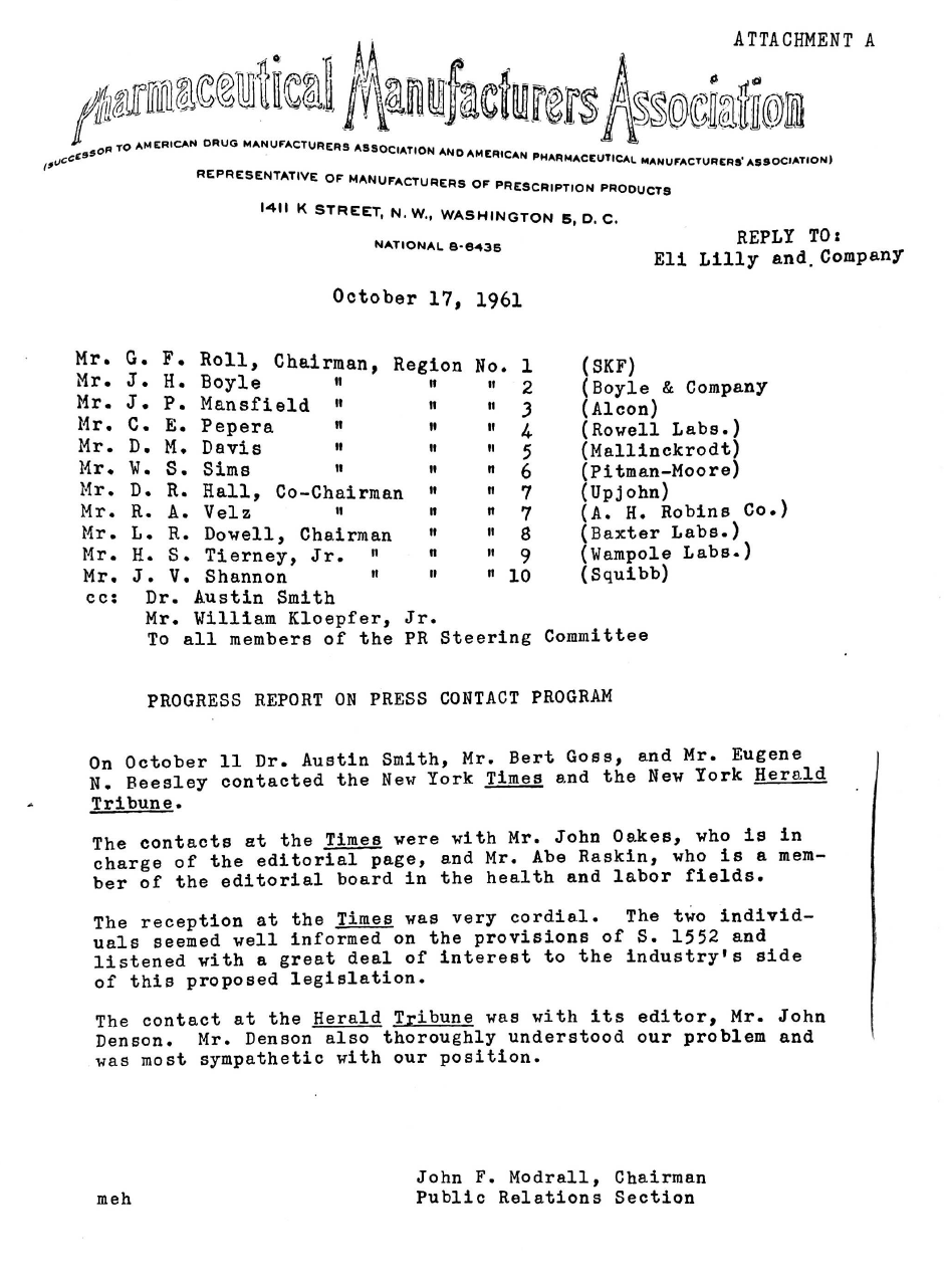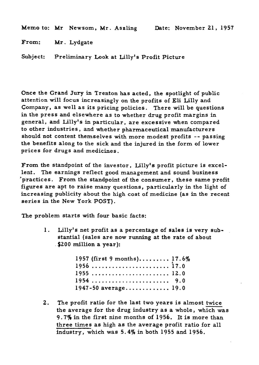 Newsom was one of the first publicists to work with the pharmaceutical industry, advising Eli Lilly for years, with a focus on pushing the idea that private enterprise and pharma profits were the key to innovation and life-saving miracles. Newsom and Lilly's other PR firm, Hill & Knowlton, would coordinate various campaigns and press pushes through the pharma trade group, the Pharmaceutical Manufacturers Association.