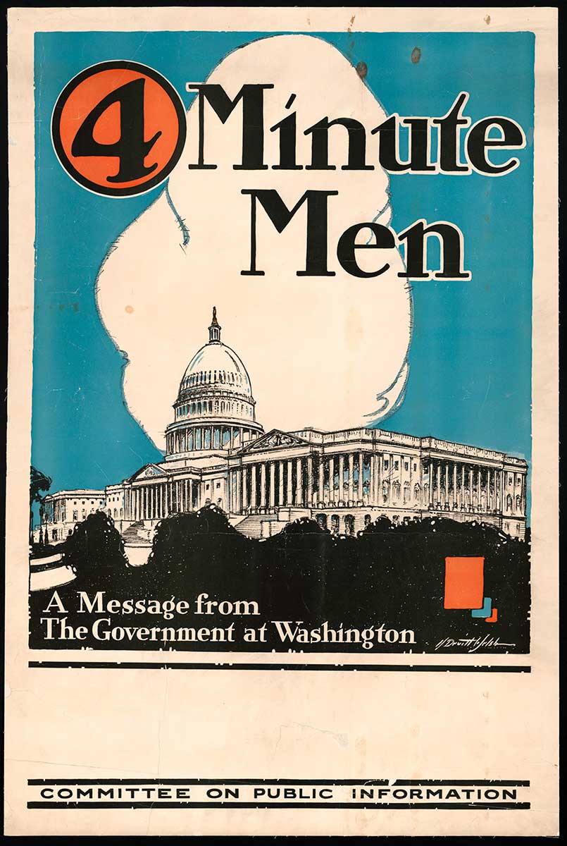 Just as Ivy Lee was building the modern PR industry, the U.S. government realized it needed a bit of propaganda to help sell American citizens on World War I. President Woodrow Wilson had made staying out of the war a key part of his campaign, and now he needed to convince Americans that it was a good idea to join in...without looking like a hypocrite. He tapped George Creel, a journalist turned political campaigner who had helped with Wilson's electoral bid, to build out what was eventually called the Committee on Public Information and generally referred to as The Creel Committee or the Creel Commission. Creel tapped some of the nation's greatest journalists (Ida Tarbell, for one!), filmmakers, artists, and publicity men to create a 360-degree assault on the American public. They made films, created compelling posters, and even launched the world's first "influencers." In cities and towns across the country, Creel and his team found influential members of society and trained them to give 4-minute pro-war speeches before screenings of silent films or big events. They were known as the "4-Minute Men".